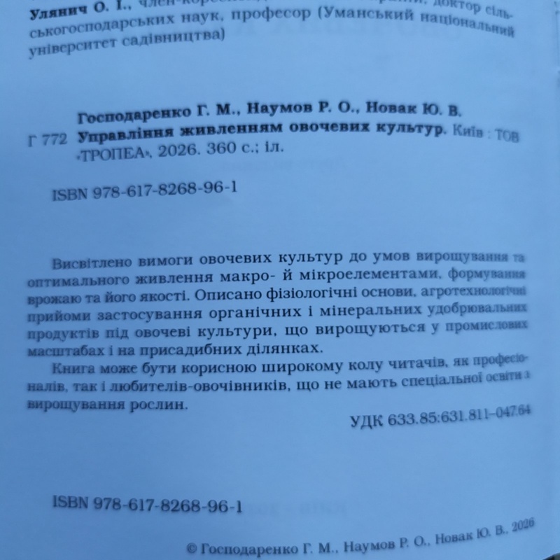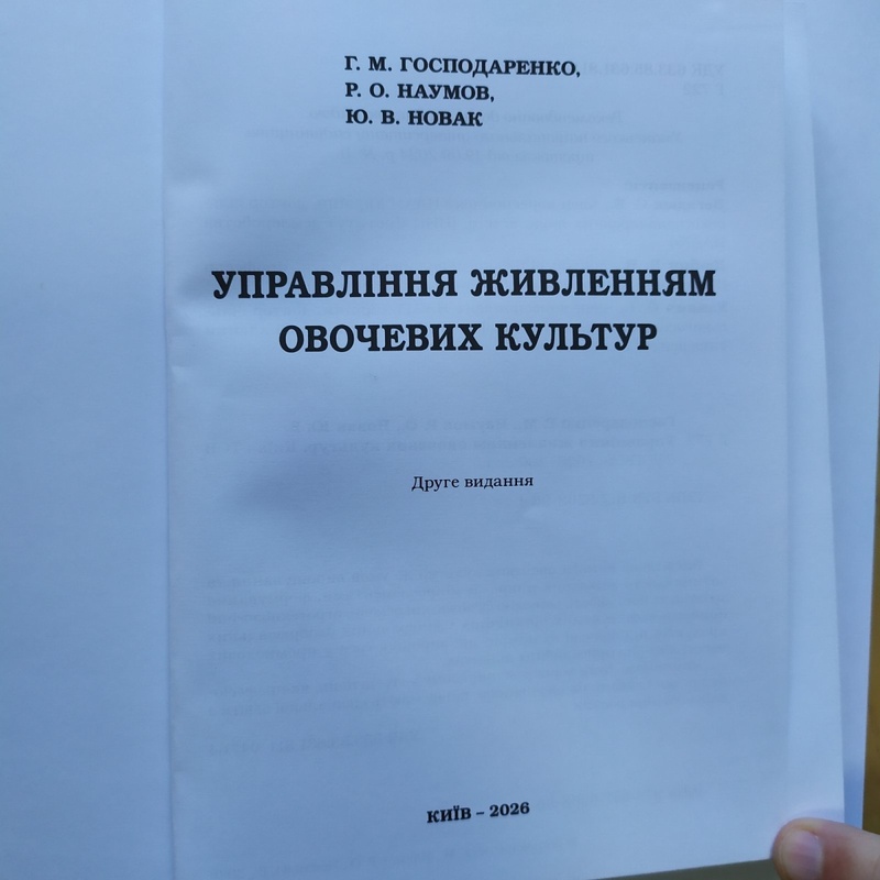 Днями у видавництві ТОВ «ТРОПЕА» вийшло з друку друге, доповнене видання книги «Управління живленням овочевих культур» за авторством Г.М. Господаренка, Р.О. Наумова та Ю.В. Новака.