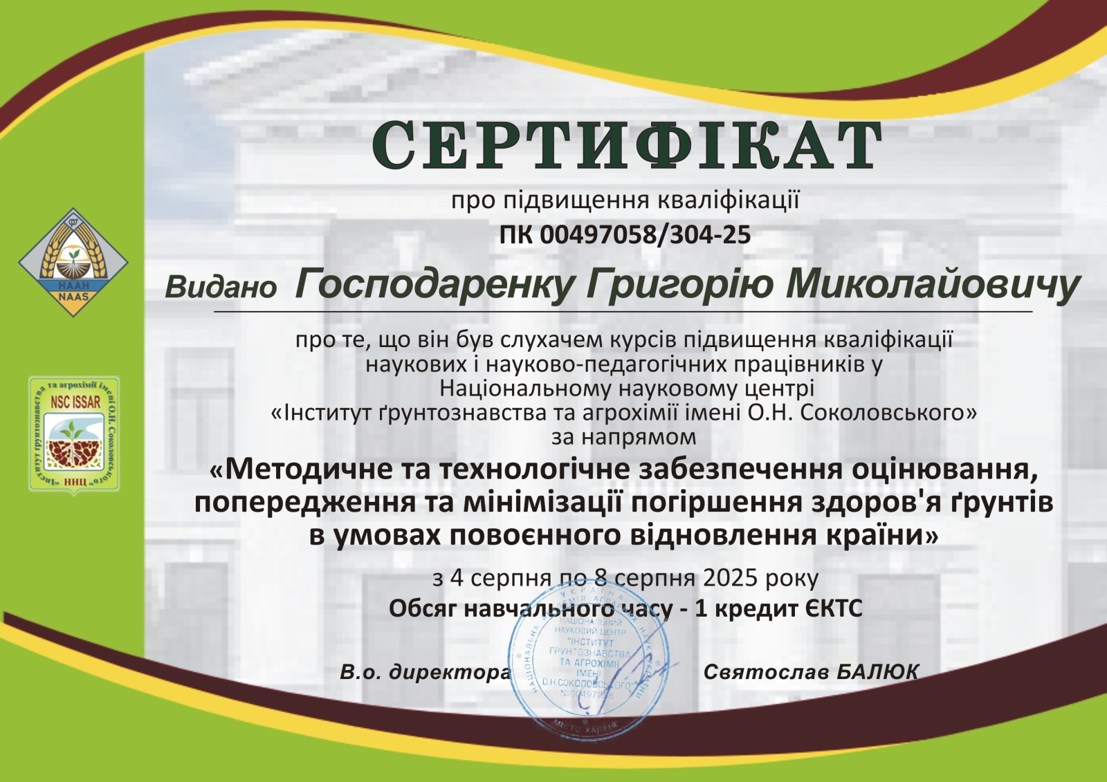 Підвищення кваліфікації проходив у Харківському національному аграрному університеті ім. В. В. Докучаєва , свідоцтво ХН № 0062 від 05.05.2021 р.